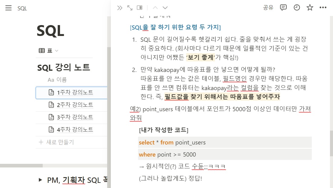 기획자 데이먼의 SQL 영상에서 SQL은 기획 현업에서도 매일 다루지는 않는다고 한다. 즉 현업에서도 SQL과 익숙해지기 쉽지는 않다는 것인데, 결국 내가 알아볼 수 있게 잘 정리해두는 것이 중요하다. 처음 한두 번은 데이터 분석가나 개발자가 친절하게 도와줄 수 있지만 비슷한 내용을 세 번 이상 물어보다보면 그들도 사람인지라 귀찮기 마련일테니까.